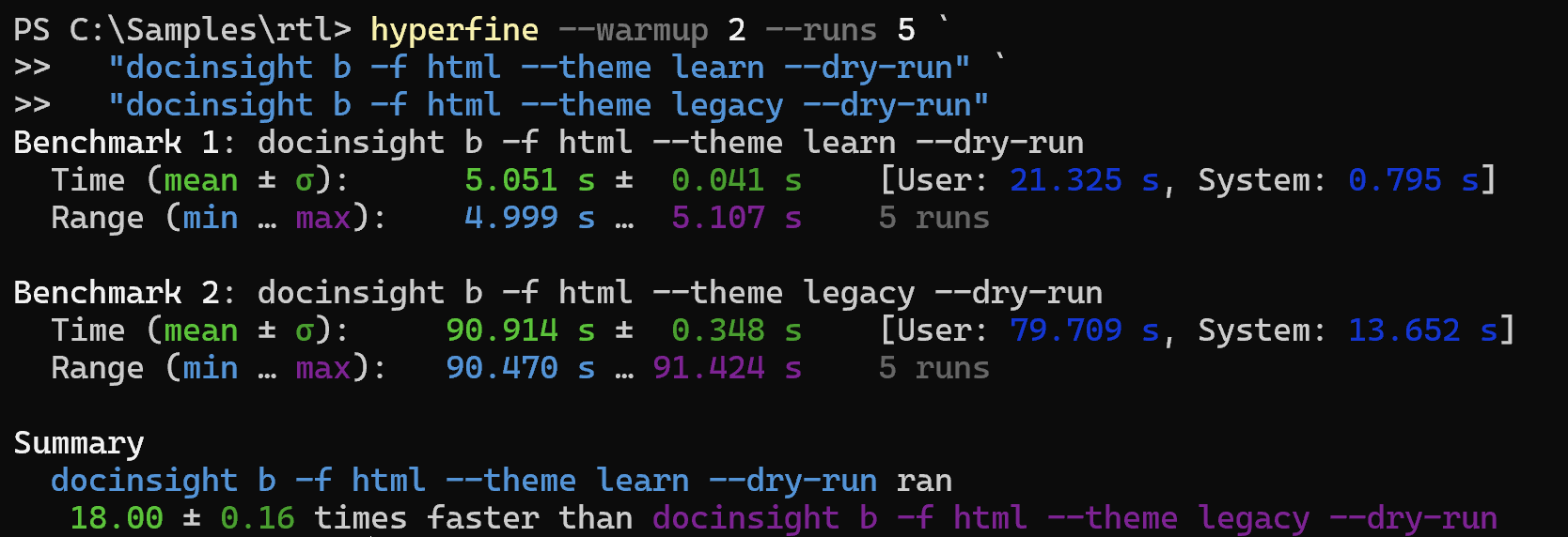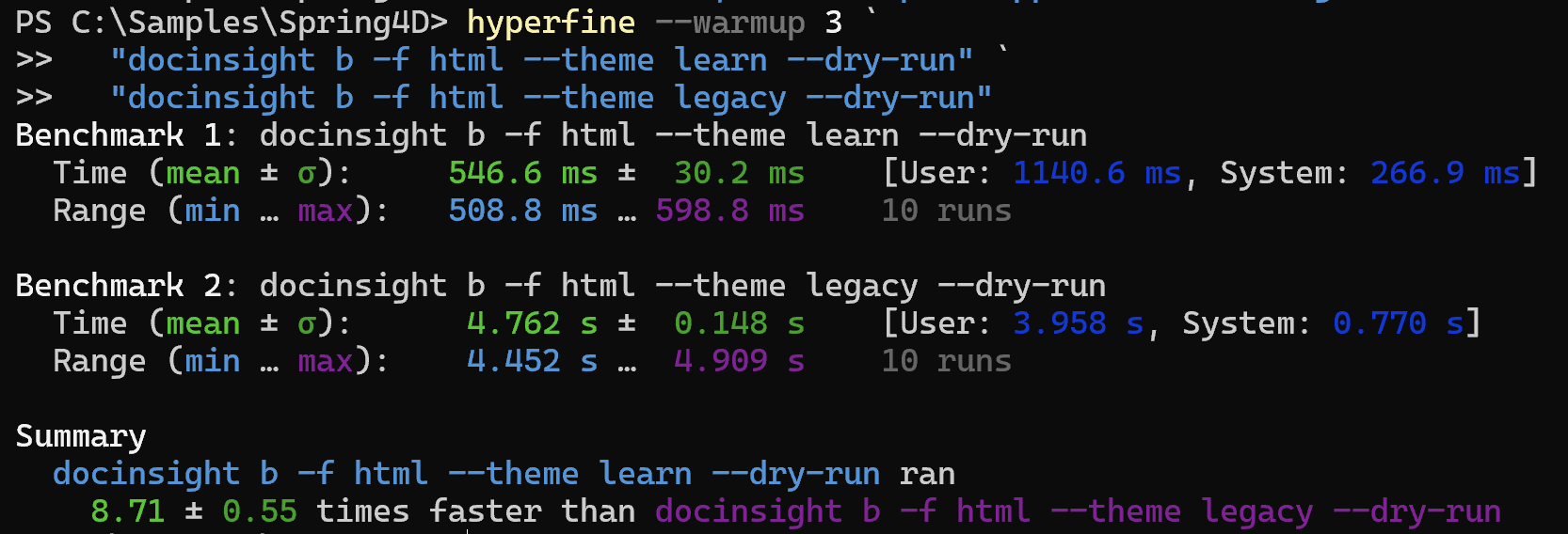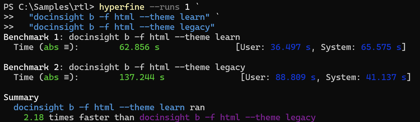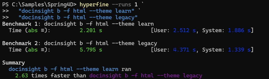 While I/O remains the primary bottleneck in the documentation generation process, the performance results still demonstrate noticeable improvements: